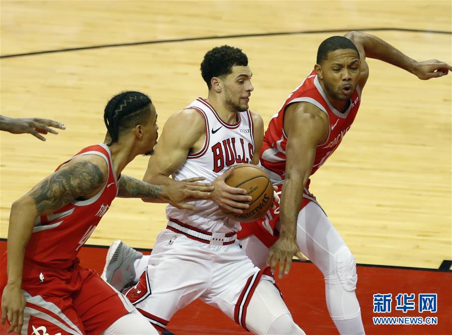 ↑12月1日,火箭队球员戈登(右)和队友格林(左)在比赛中防守公牛队球员拉文。 当日,在2018-2019赛季NBA常规赛中,休斯敦火箭队主场以121比105战胜芝加哥公牛队。 新华社发(宋穹摄)