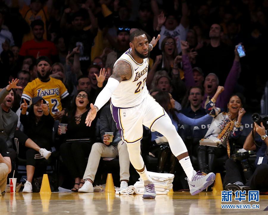12月2日,湖人队球员勒布朗·詹姆斯在比赛中庆祝得分。 当日,在2018-2019赛季NBA联赛常规赛中,洛杉矶湖人队主场以120比96战胜菲尼克斯太阳队。 新华社发(赵汉荣摄)