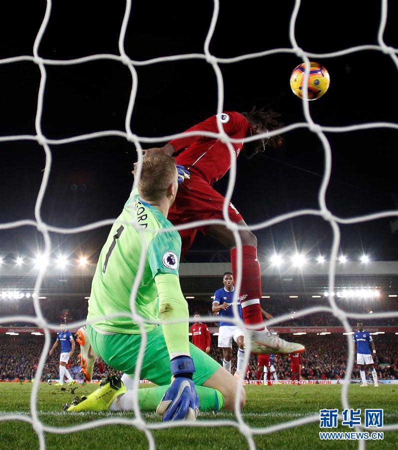 12月2日,利物浦队球员奥里吉(上)在比赛中头球破门。 当日,在2018-2019赛季英超联赛第14轮比赛中,利物浦队主场以1比0战胜埃弗顿队。 新华社/路透
