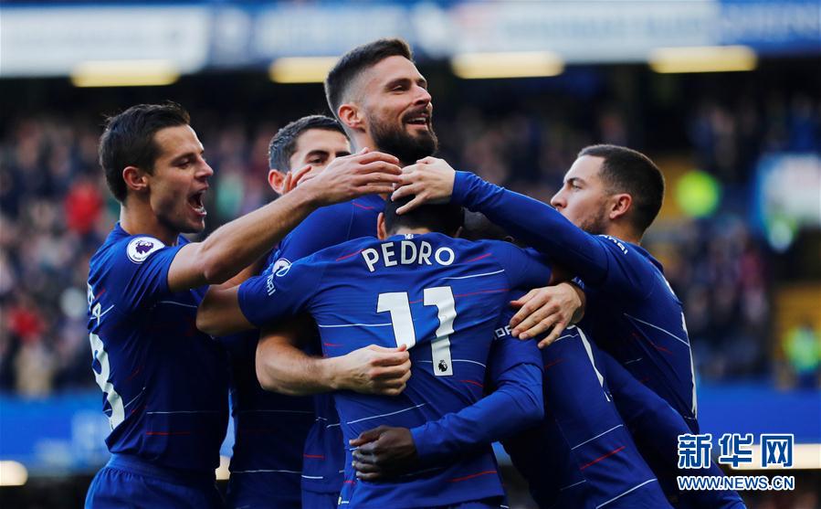 12月2日,切尔西队球员在比赛中庆祝进球。 当日,在2018-2019赛季英超联赛第14轮比赛中,切尔西队主场以2比0战胜富勒姆队。 新华社/路透