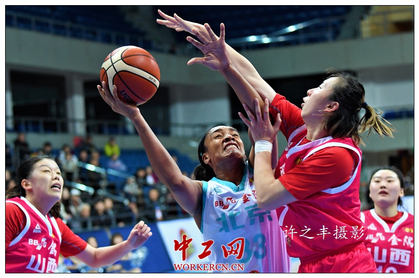 2018年12月3日晚,北京首钢篮球中心,北京首钢女篮主场以75比55战胜山西女篮。双方比赛数据:首钢队摩根塔克赢得25分,邵婷12分,高颂10分,冯帆8分。山西队武桐桐14分,郭子瑄12分,吴迪11分,夸妮塔11分。图为双方的比赛。工人日报-中工网记者许之丰摄影报道