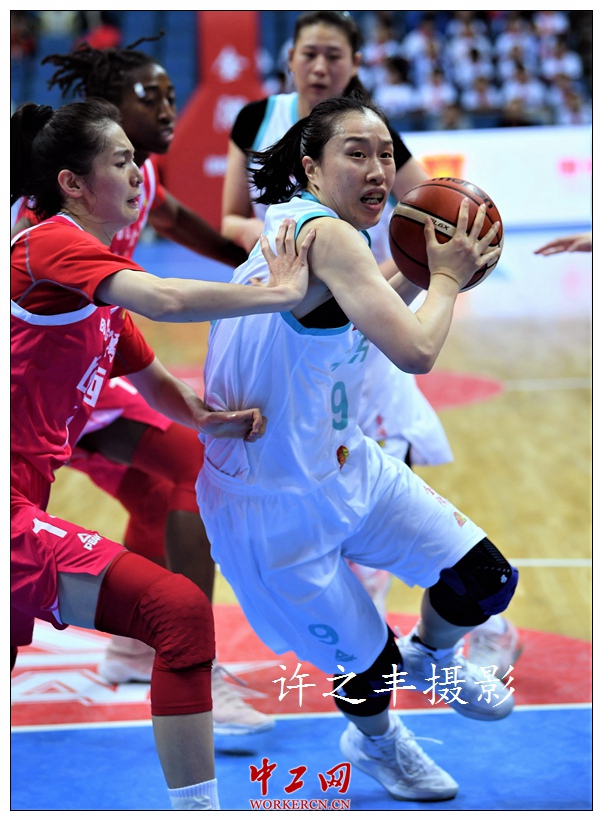 2018年12月3日晚,北京首钢篮球中心,北京首钢女篮主场以75比55战胜山西女篮。双方比赛数据:首钢队摩根塔克赢得25分,邵婷12分,高颂10分,冯帆8分。山西队武桐桐14分,郭子瑄12分,吴迪11分,夸妮塔11分。图为双方的比赛。工人日报-中工网记者许之丰摄影报道