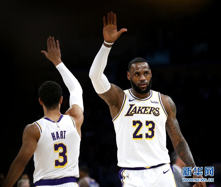 12月2日,湖人队球员勒布朗·詹姆斯(右)与队友哈特在比赛中庆祝得分。 当日,在2018-2019赛季NBA联赛常规赛中,洛杉矶湖人队主场以120比96战胜菲尼克斯太阳队。 新华社发(赵汉荣摄)