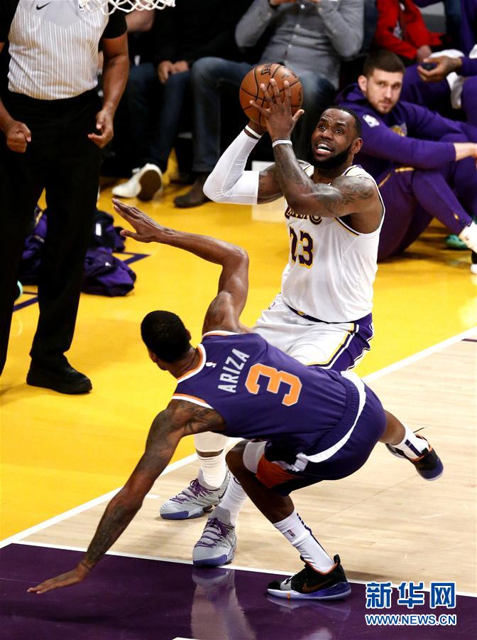 12月2日,湖人队球员勒布朗·詹姆斯(后)在比赛中进攻受阻。 当日,在2018-2019赛季NBA联赛常规赛中,洛杉矶湖人队主场以120比96战胜菲尼克斯太阳队。 新华社发(赵汉荣摄)