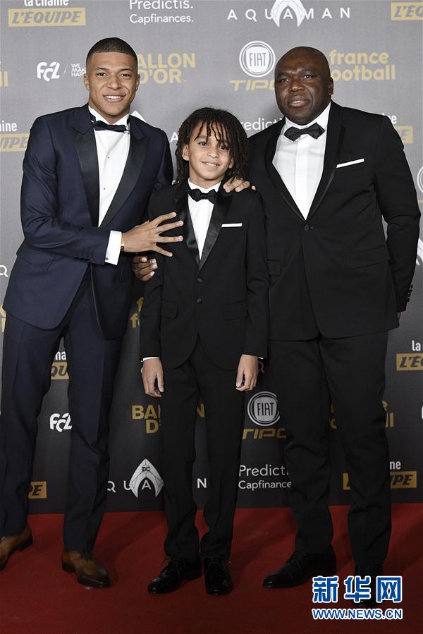 12月3日,效力于巴黎圣日耳曼球队的法国球员基利安·姆巴佩(左)与其弟弟埃唐·姆巴佩和父亲维尔弗里德·姆巴佩到达颁奖典礼现场。 新华社发(杰克·陈摄)