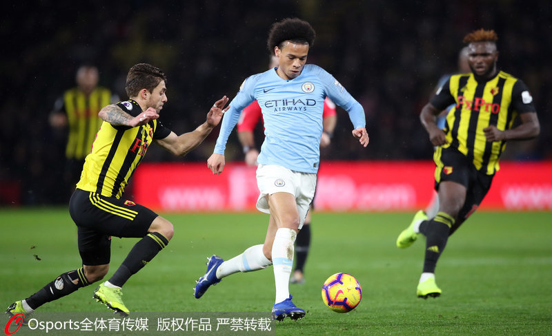 人民网北京12月5日电(杨磊) 北京时间12月5日凌晨,2018/19赛季英超第15轮继续进行,曼城客场2比1力克沃特福德,萨内进球,马赫雷斯传射,杜库雷扳回一城。曼城联赛7连胜后继续领跑。