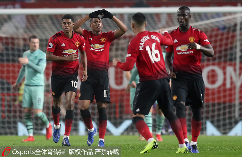 仅过了4分钟,曼联就迅速追平了比分。第30分钟,罗霍在禁区前沿30码处直接任意球轰门,莱诺扑球脱手,埃雷拉跟上在右侧传中,门前的马夏尔抢点破门,将比分扳为了1-1平。