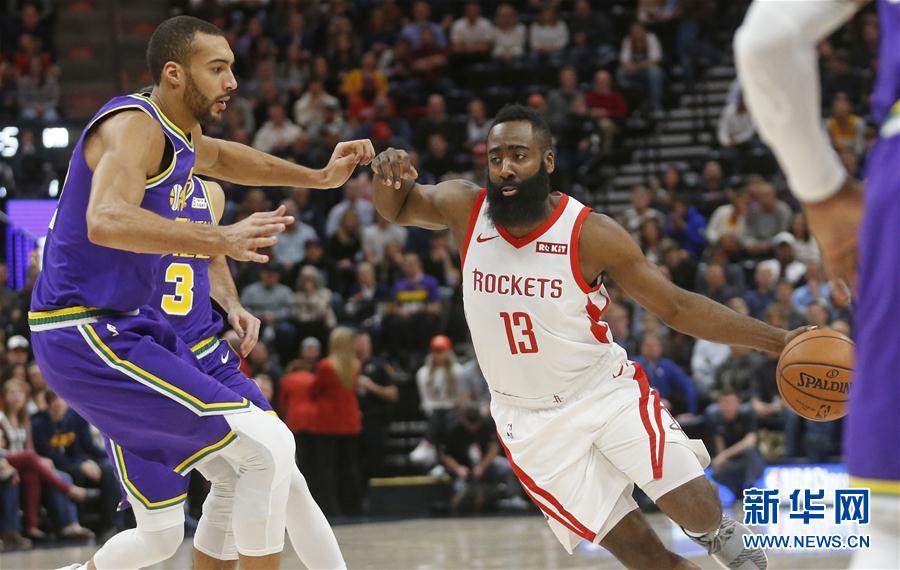 12月6日,火箭队球员哈登(右)在比赛中带球突破。 当日,在2018-2019赛季NBA常规赛中,犹他爵士队主场以118比91战胜休斯敦火箭队。 新华社/美联