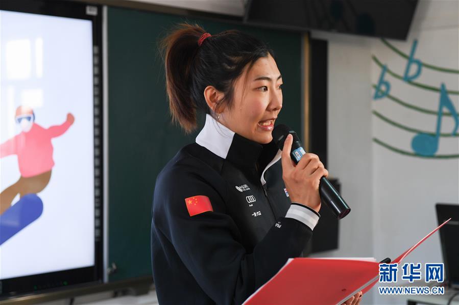 12月9日,自由式滑雪空中技巧国家集训队队员徐梦桃与学生分享自己练习滑雪的故事。 新华社记者刘磊摄