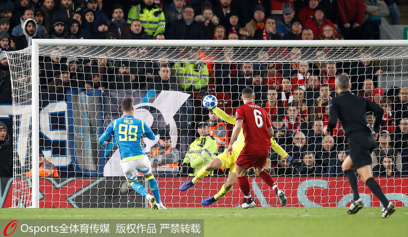 利物浦第34分钟打破僵局,米尔纳传球,摆脱鲁伊的萨拉赫禁区右侧闪过库利巴利后小角度低射,皮球从奥斯皮纳双腿间穿过入网。
