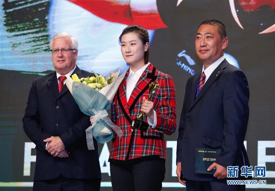 12月12日,获得年度最佳女运动员奖的中国选手丁宁(中)在颁奖典礼上。 当日,国际乒联2018年度颁奖典礼在韩国仁川举行。 新华社记者 王婧嫱 摄