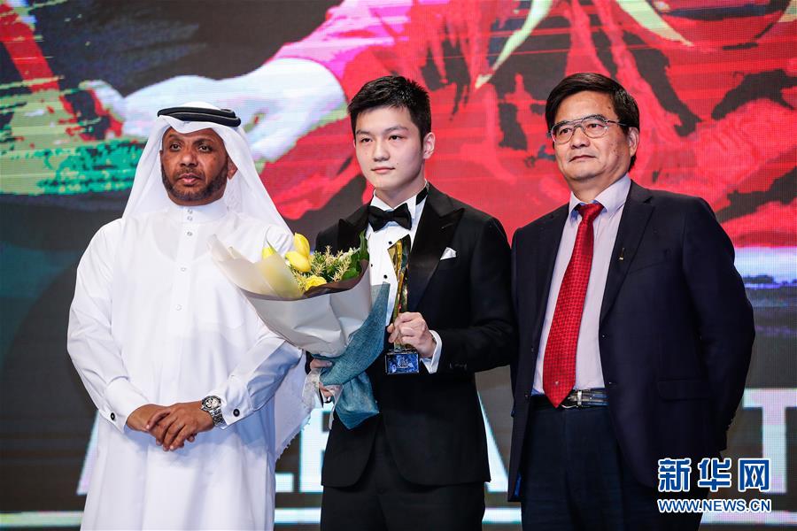 12月12日,获得年度最佳男运动员奖的中国选手樊振东(中)在颁奖典礼上。 当日,国际乒联2018年度颁奖典礼在韩国仁川举行。 新华社记者 王婧嫱 摄