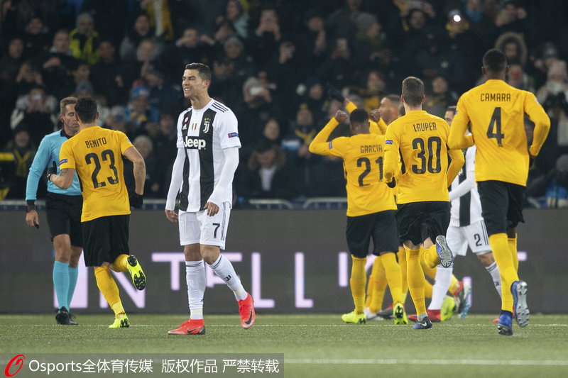 C罗第87分钟几乎扳平。贝尔纳代斯基左肋弧线球斜传后点,C罗在门前5米处小角度头球击中近门柱外侧。尤文最终1比2客负。年轻人则取得史上冠军联赛小组赛首胜。