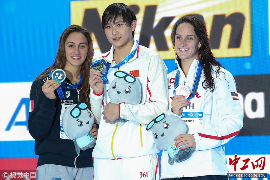 2018年12月13日,浙江杭州,2018短池游泳世锦赛女子800米自由泳决赛,王简嘉禾夺冠。图片来源:视觉中国