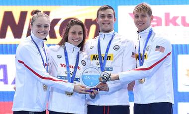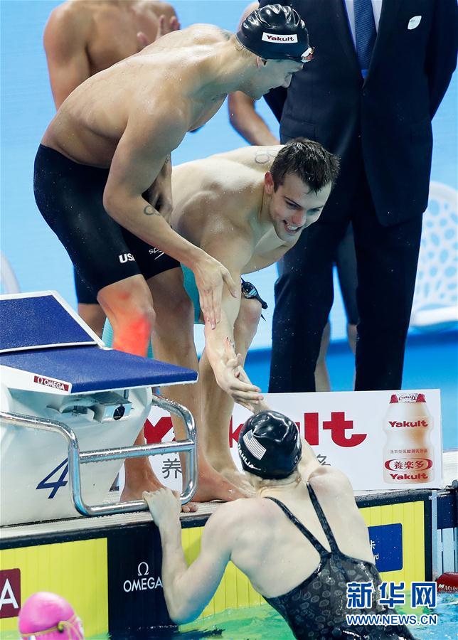 12月12日,美国队最后一棒选手凯尔茜·戴利娅(下)在夺冠后接受队友赫尔德(上右)的祝贺。 当日,在浙江杭州举行的2018国际泳联短池游泳世界锦标赛男女混合4X50米自由泳接力决赛中,美国队以1分27秒89的成绩夺得冠军,并打破世界纪录。 新华社记者王丽莉摄