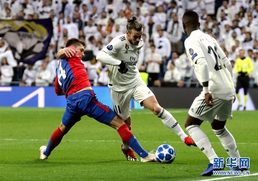 12月12日,皇家马德里队球员贝尔(中)与莫斯科中央陆军队球员基里尔·纳巴布金(左)在比赛中争抢。 当日,在2018-2019赛季欧冠联赛G组比赛中,西班牙皇家马德里队主场以0比3负于俄罗斯莫斯科中央陆军队。 新华社发