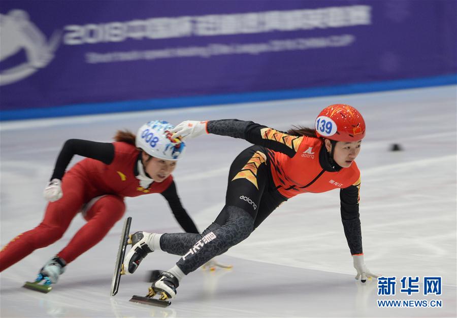12月13日,黑龙江省滑冰协会选手王欣然(右)在女子500米预赛中。 当日,2018中国杯短道速滑精英赛(青岛站)开赛。 新华社发