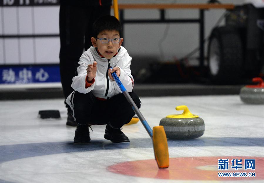 12月13日,南岗区初中男二队队员龚一可在比赛中,他所在的队伍以9比1战胜南岗区初中男一队。 当日,2018-2019学年度哈尔滨市中小学生冰壶比赛开赛,来自哈尔滨7个区的34支队伍参加了比赛。 新华社记者王凯摄
