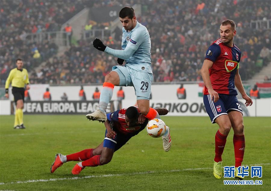 切尔西队球员莫拉塔(上)在比赛中拼抢。 新华社/路透