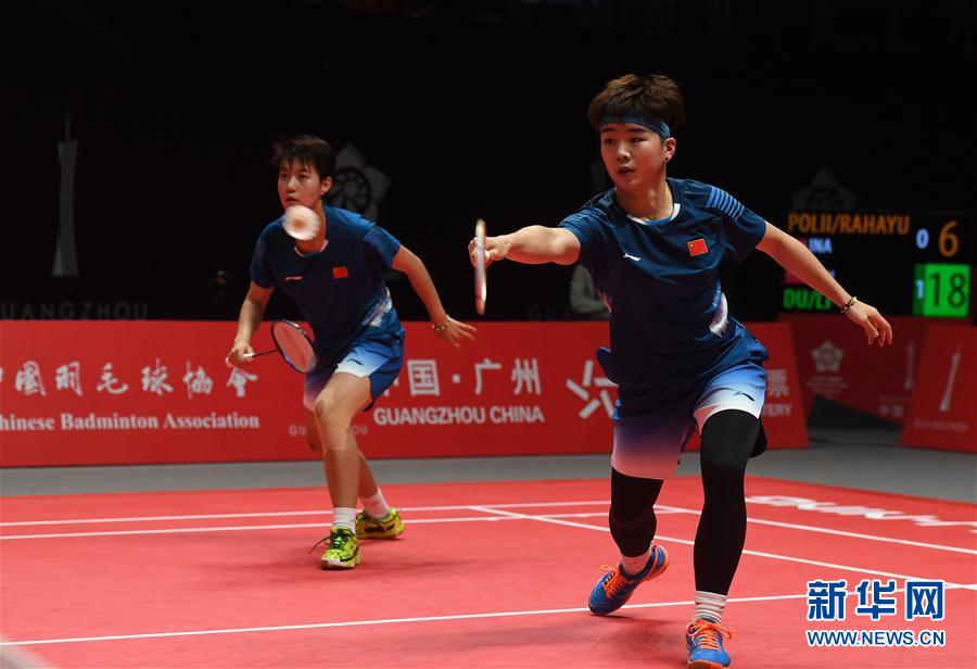 12月14日,中国选手杜玥/李茵晖(右)在比赛中。 当日,在2018世界羽联世界巡回赛总决赛女双A组比赛中,中国选手杜玥/李茵晖以2比0战胜印度尼西亚选手波莉/拉哈尤。 新华社记者李俊东摄