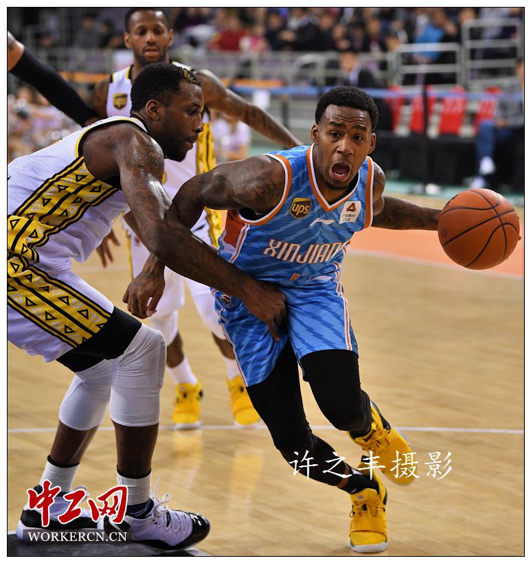 2018年12月14日晚,北京奥体中心体育馆,CBA第19轮联赛北京农商行队119比107新疆队,新疆队遭遇京城两连败。北京农商行队也是对新疆队历史的首次获胜。图为比赛双方的拼抢。