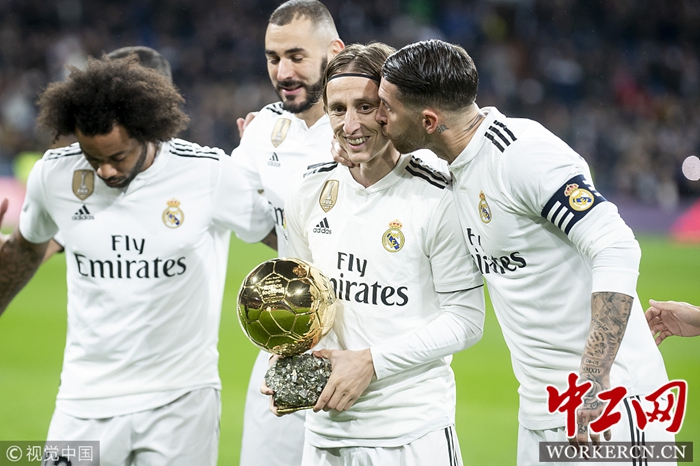 2018年12月15日,西班牙,18/19西甲第16轮,皇马Vs巴列卡诺,球员赛前展示金球奖奖杯。