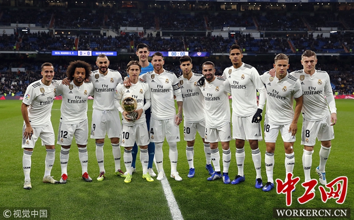 2018年12月15日,西班牙,18/19西甲第16轮,皇马Vs巴列卡诺,球员赛前展示金球奖奖杯。