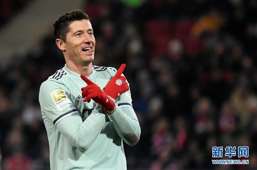12月15日,拜仁队球员莱万多夫斯基在比赛中庆祝进球。 当日,在2018-2019赛季德甲联赛第15轮比赛中,拜仁慕尼黑队客场以4比0战胜汉诺威96队。 新华社/路透