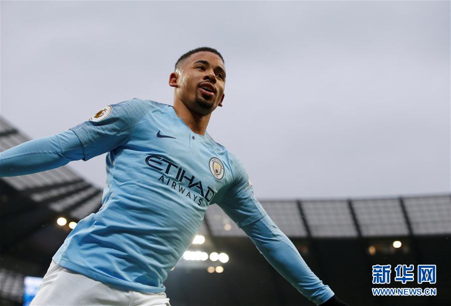 12月15日,曼城队球员热苏斯在比赛中庆祝进球。 当日,在2018-2019赛季英超联赛第17轮比赛中,曼城队主场以3比1战胜埃弗顿队。 新华社/路透