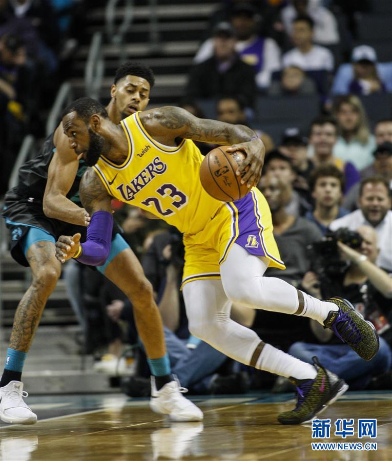 12月15日,湖人队球员詹姆斯(前)在比赛中突破。 当日,在2018-2019赛季NBA常规赛中,洛杉矶湖人队客场以128比100战胜夏洛特黄蜂队。 新华社/美联