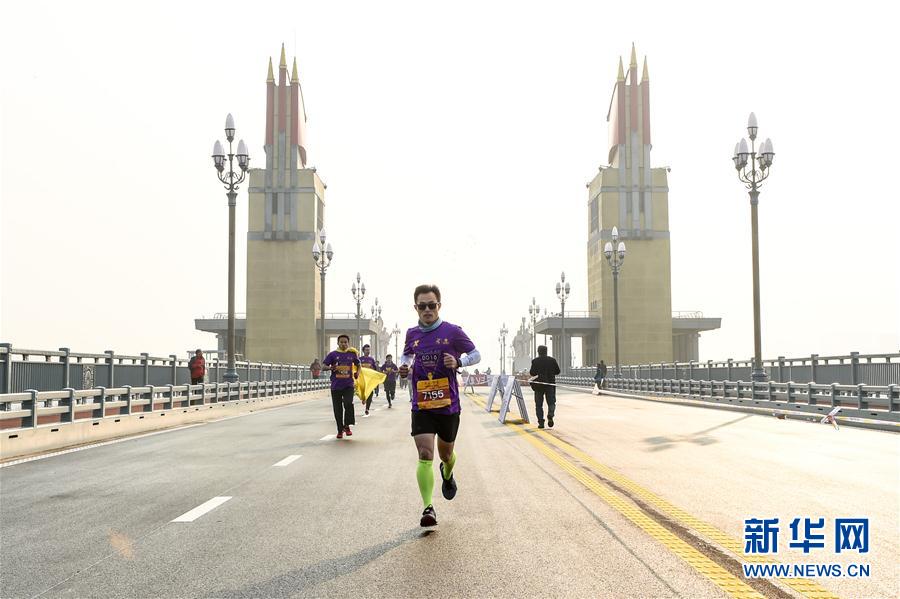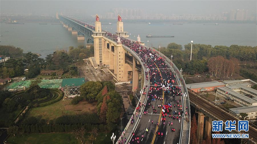 12月16日,跑步爱好者在纪念跑活动中(无人机拍摄)。 当日,南京长江大桥通车50周年纪念跑在南京长江大桥南引桥鸣枪开跑。 新华社记者李博摄