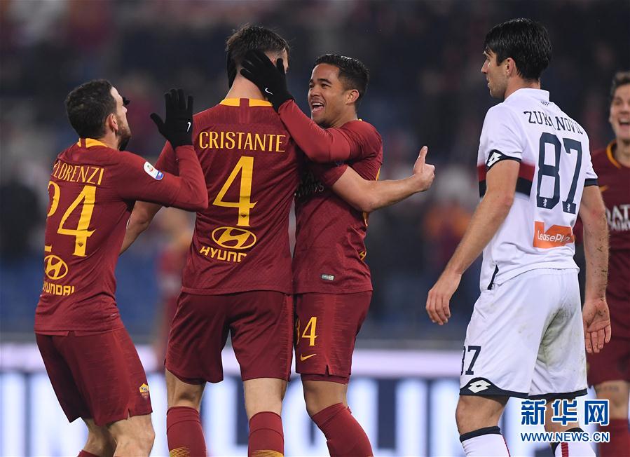 12月16日,罗马队球员克里斯坦特(左二)与队友庆祝进球。 当日,在2018-2019赛季意大利足球甲级联赛第16轮比赛中,罗马队主场以3比2战胜热那亚队。 新华社发