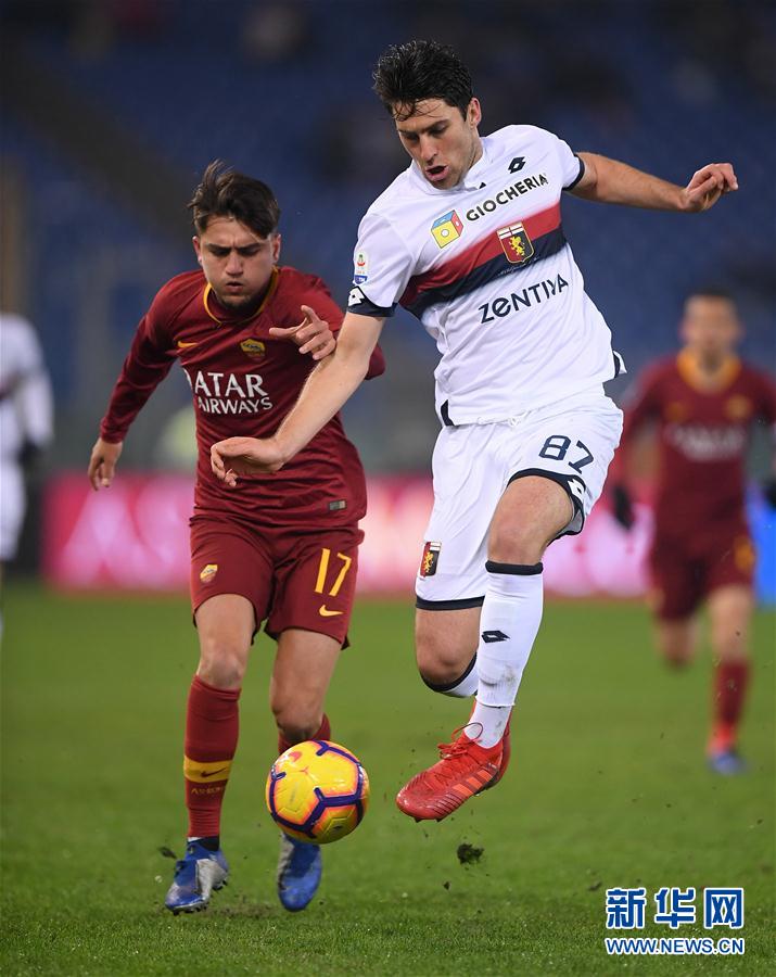 罗马队球员云代尔(左)与热那亚队球员祖卡诺维奇在比赛中拼抢。 新华社发
