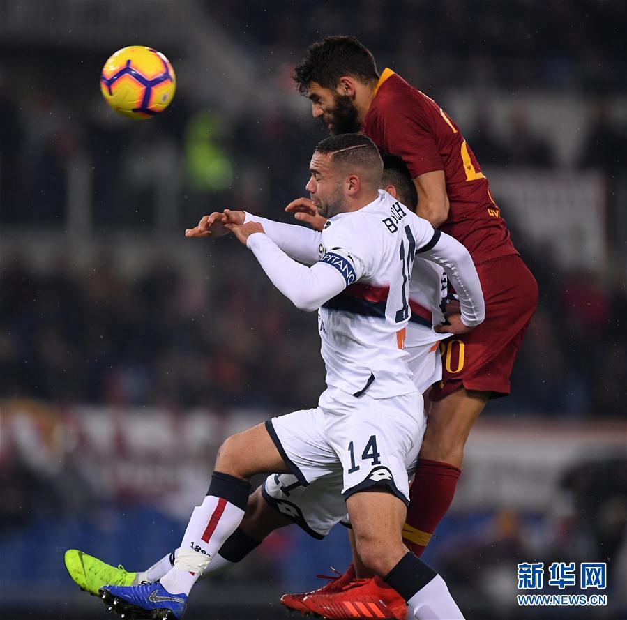 罗马队球员法西奥(右)与热那亚队球员比拉斯基在比赛中争顶。 新华社发