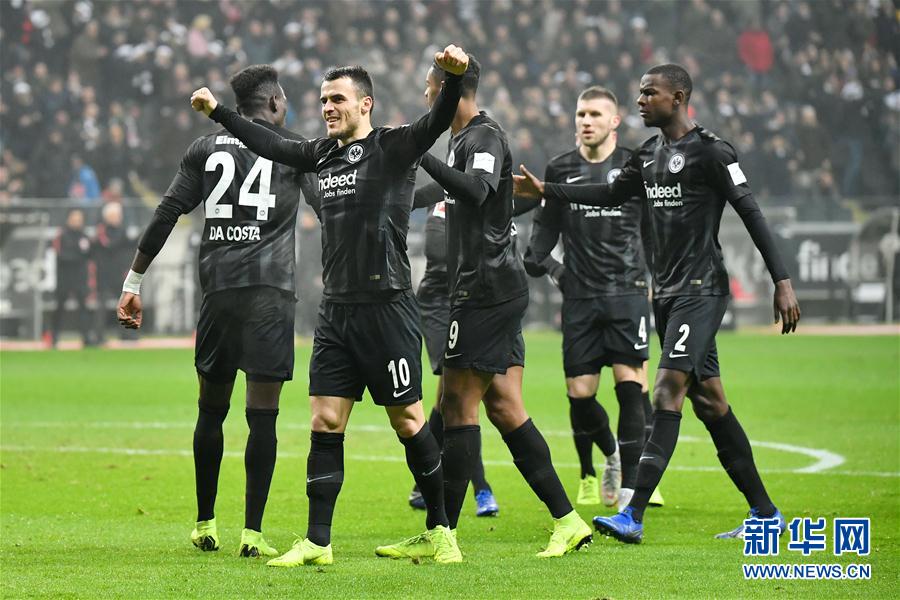 12月16日,法兰克福队球员在比赛中庆祝进球。 当日,在2018-2019赛季德国足球甲级联赛第15轮比赛中,法兰克福队主场以2比1战胜勒沃库森队。 新华社发