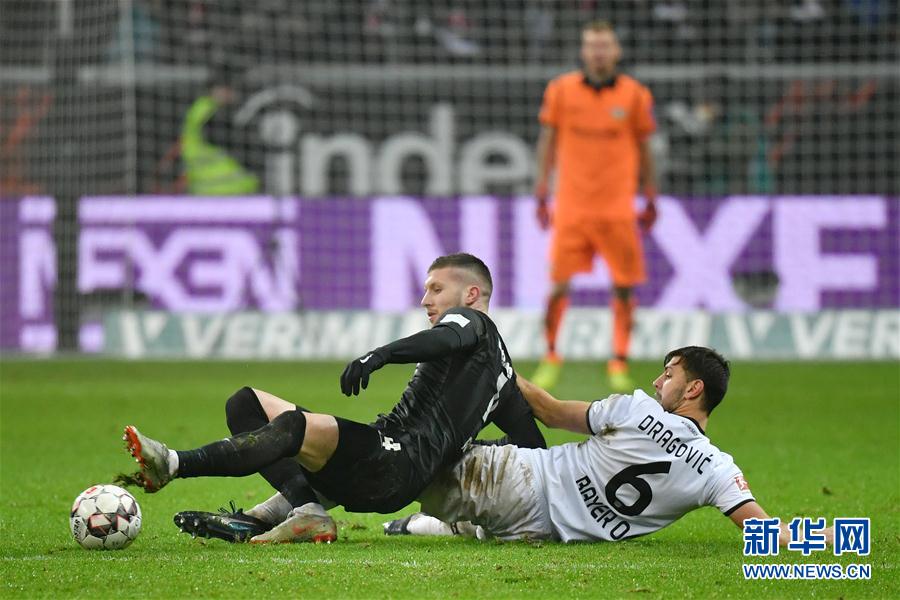 法兰克福队球员雷比奇(左)与勒沃库森队球员德拉戈维奇在比赛中拼抢。新华社发