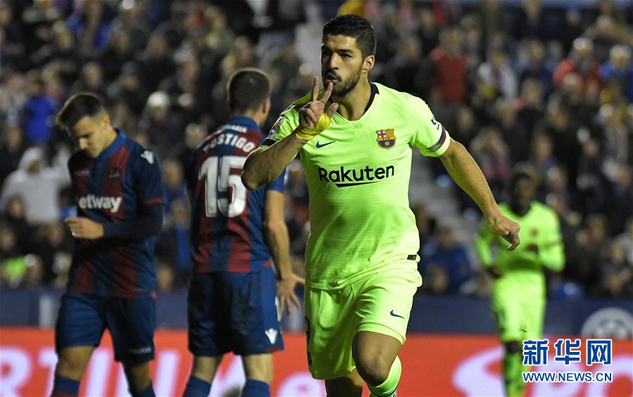 12月16日,巴塞罗那队球员苏亚雷斯(前)庆祝进球。 当日,在2018-2019赛季西班牙足球甲级联赛第16轮比赛中,巴塞罗那队客场以5比0战胜莱万特队。 新华社/法新