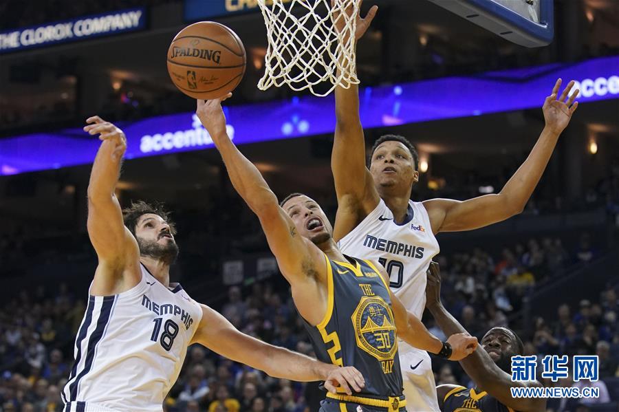 勇士队球员卢尼(左)与灰熊队球员马克·加索尔拼抢篮板球。 新华社/路透