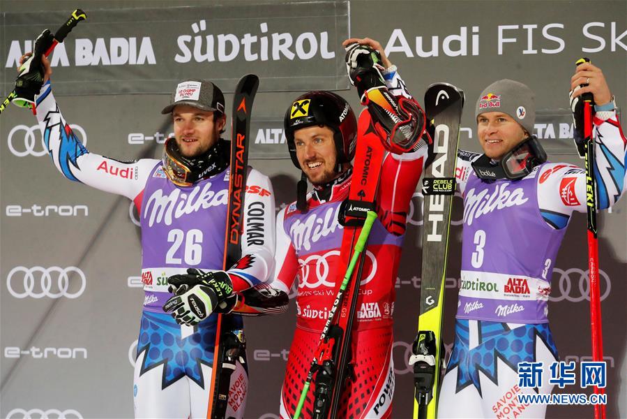 12月17日,冠军奥地利选手马塞尔·希尔斯赫(中)与亚军法国选手法夫罗(右)、季军法国选手亚历克西斯·品图劳尔特在颁奖仪式上合影。 当日,奥地利高山滑雪运动员希尔斯赫在意大利阿尔塔巴迪亚进行的高山滑雪世界杯男子平行大回转比赛中夺冠,继前一日的大回转之后,将本站两个项目的冠军收入囊中。 新华社/路透