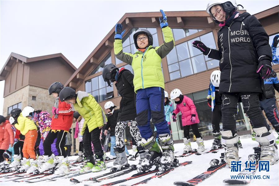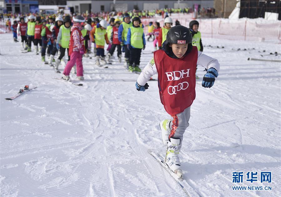 12月18日,在吉林北大壶滑雪场,吉林市第二实验小学学生们在滑雪课上通过趣味游戏体验单脚雪地滑行。 新华社记者许畅摄