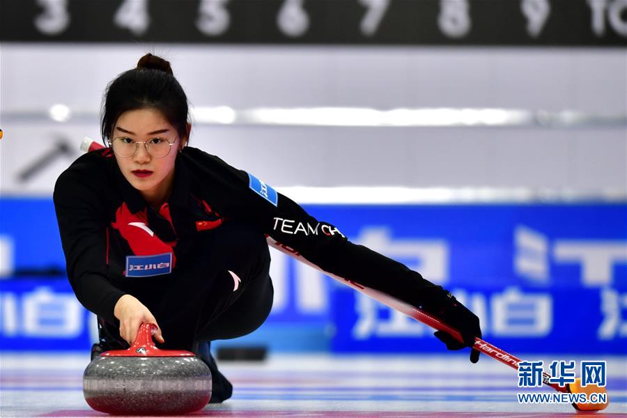 12月18日,中国女子B队选手范苏圆在比赛中掷壶。 当日,在青海多巴国家高原体育训练基地举行的的2018中国青海国际冰壶精英赛第五日比赛中,中国女子B队以6比3战胜美国女队。 新华社发(张龙摄)