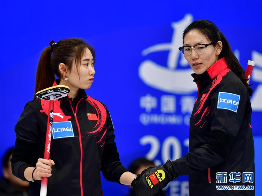 12月18日,中国女子B队选手张迪(右)在与队友王美妮在比赛中讨论战术。 当日,在青海多巴国家高原体育训练基地举行的的2018中国青海国际冰壶精英赛第五日比赛中,中国女子B队以6比3战胜美国女队。 新华社发(张龙摄)