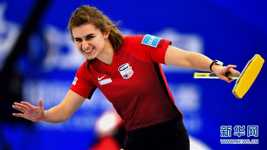 12月18日,美国女队选手迈尔斯在比赛中。 当日,在青海多巴国家高原体育训练基地举行的的2018中国青海国际冰壶精英赛第五日比赛中,中国女子B队以6比3战胜美国女队。 新华社发(张龙摄)