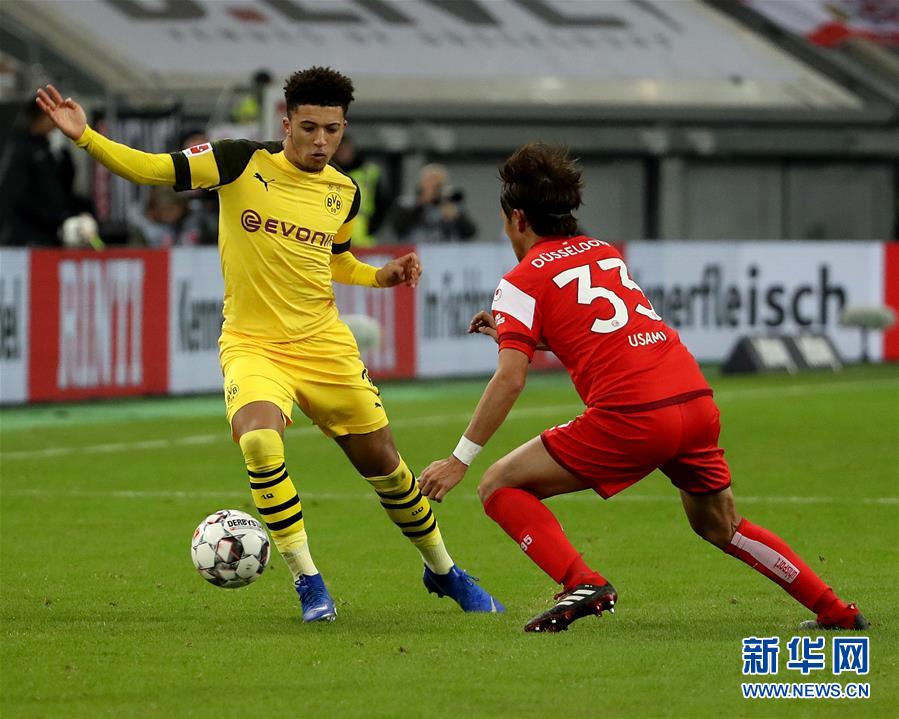 12月18日,多特蒙德队球员桑乔(左)与杜塞尔多夫队球员宇佐美贵史在比赛中拼抢。 当日,在2018-2019赛季德国足球甲级联赛第16轮比赛中,多特蒙德队客场以1比2不敌杜塞尔多夫队。 新华社发