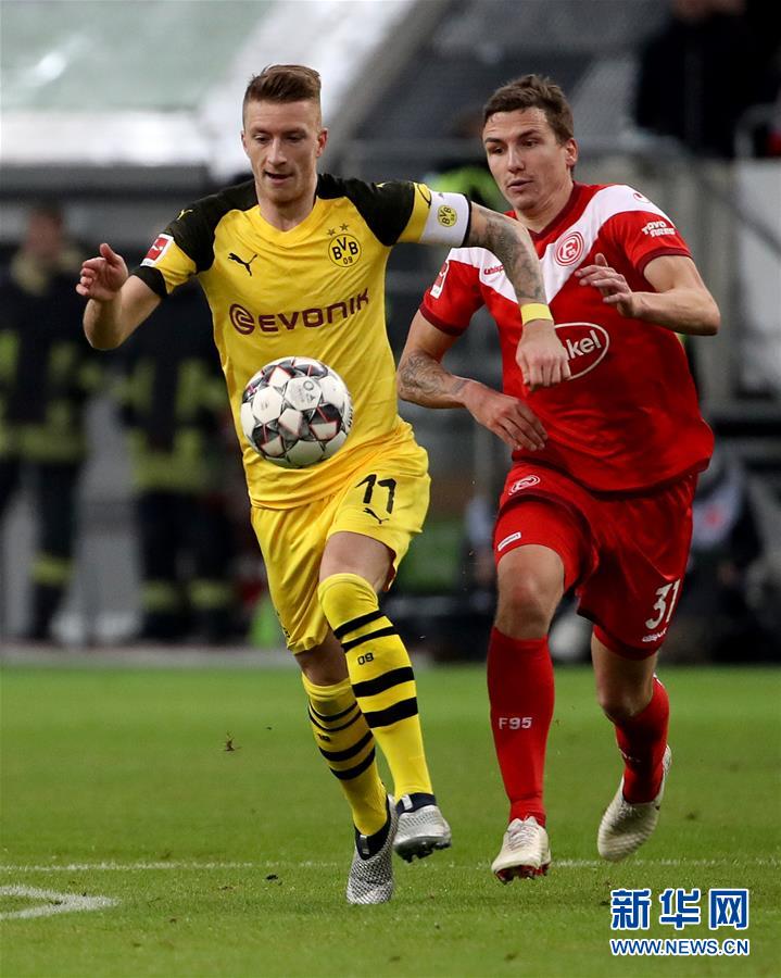 多特蒙德队球员罗伊斯(左)与杜塞尔多夫队球员索博特卡在比赛中拼抢。 新华社发