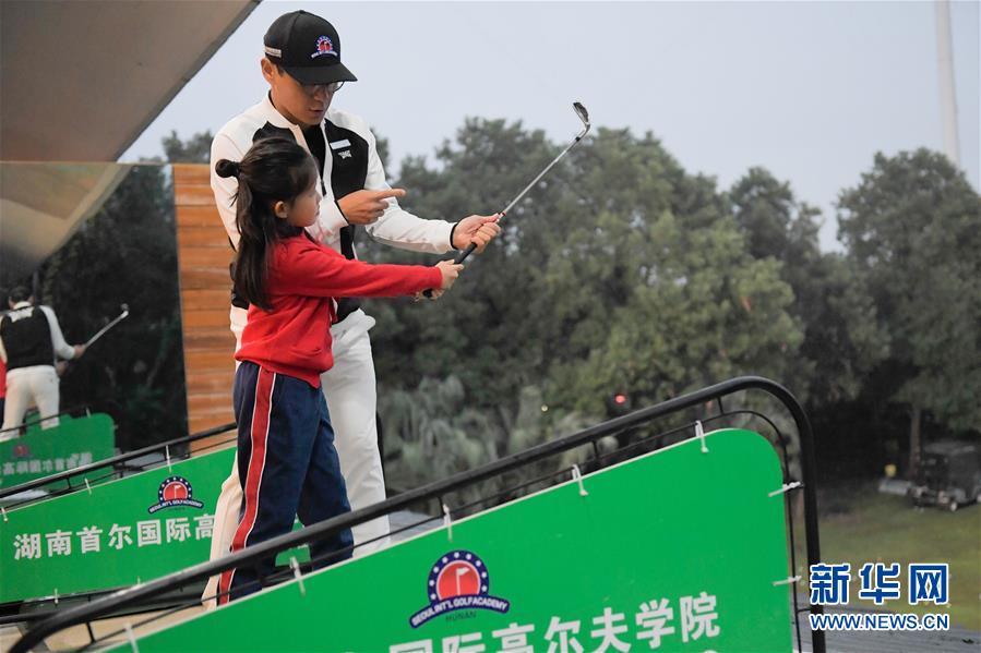 这是金绪晋(右)在湖南首尔国际高尔夫学院训练场为8岁学员师静悠讲解握杆要领(11月20日摄)。