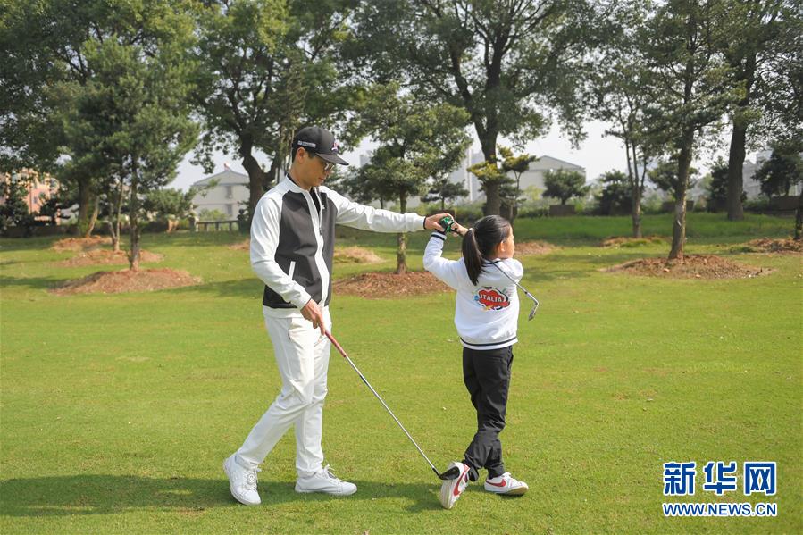 这是金绪晋(左)在湖南华雅城市高尔夫俱乐部训练场为8岁学员师静悠讲解收杆姿势(11月22日摄)。 新华社发(陈泽国摄)