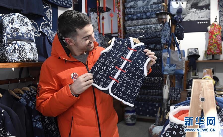 这是2018年12月13日,罗切斯特在天津古文化街为女儿挑选中式棉服。 新华社记者李然摄