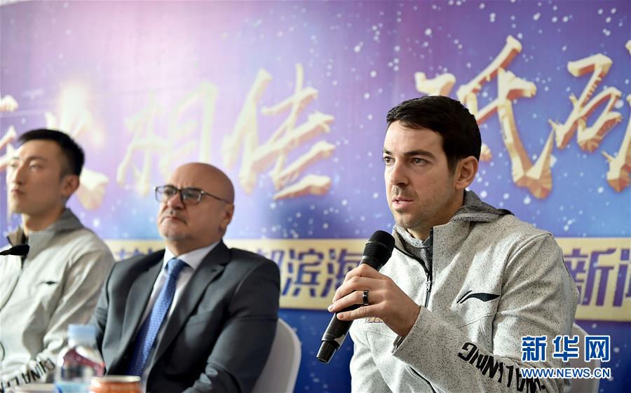 这是2018年10月13日,刚刚加盟天津滨海云商金控队的罗切斯特(右一)在新闻发布会上发言。 新华社记者岳月伟摄