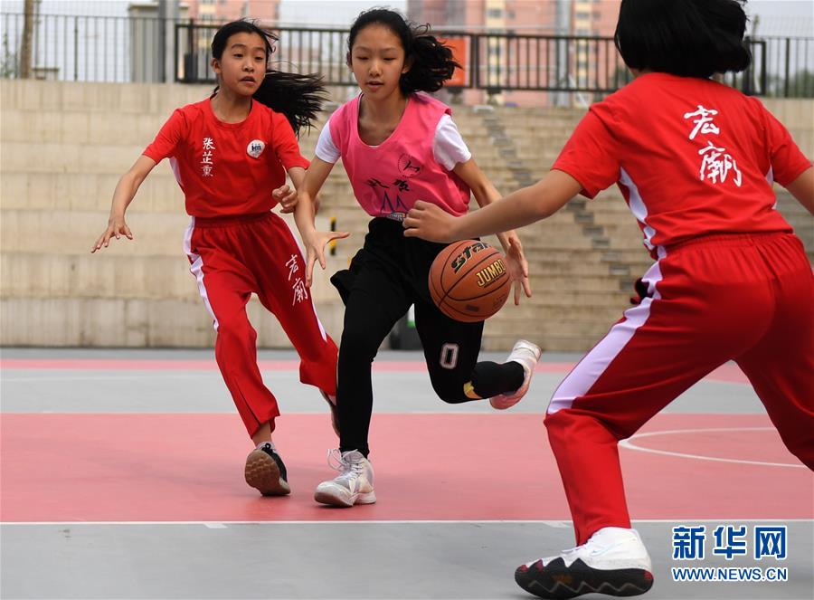 图为2018年4月19日,来自中关村第三小学的小球员(中)在2018北京市“小篮球”工作启动仪式表演赛中带球突破的资料照片。 新华社记者张晨霖摄